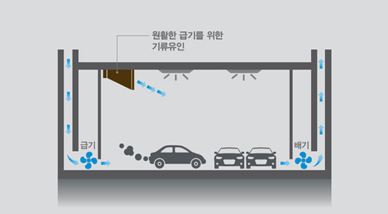 - 일산화탄소 자동감지 센서를 설치하여, 농도가 일정 기준을 넘을 경우 주차장 환기휀이 자동으로 자동하여 오염된 공기를 외부로 배출함.