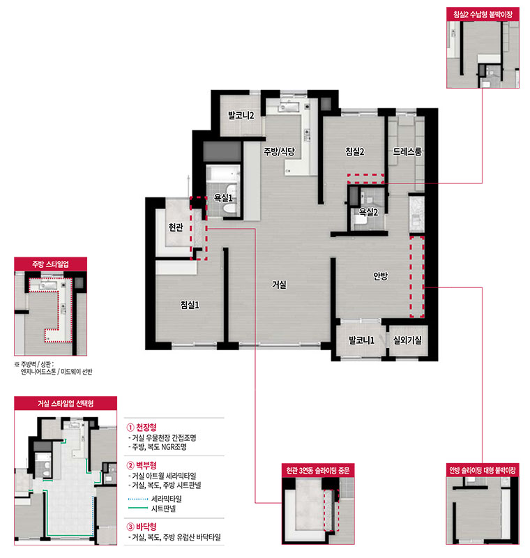 일부세대는 대칭형으로도 시공되어 일부 거실, 안방, 침실, 주방의 향이 달라질 수 있으니 필히 확인하시기 바랍니다.