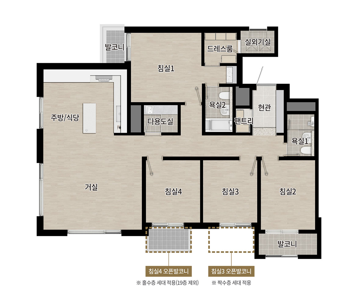 ※ 일부세대는 대칭형으로도 시공되어 일부 거실, 안방, 침실, 주방의 향이 달라질 수 있으니 필히 확인하시기 바랍니다.